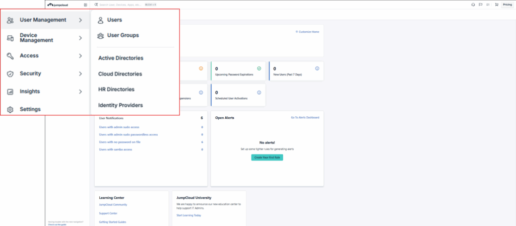 - User Management: This section has been enhanced with the inclusion of Active Directories, Cloud Directories, HR Directories, and Identity Providers, all of which were previously grouped under Directory Integrations.