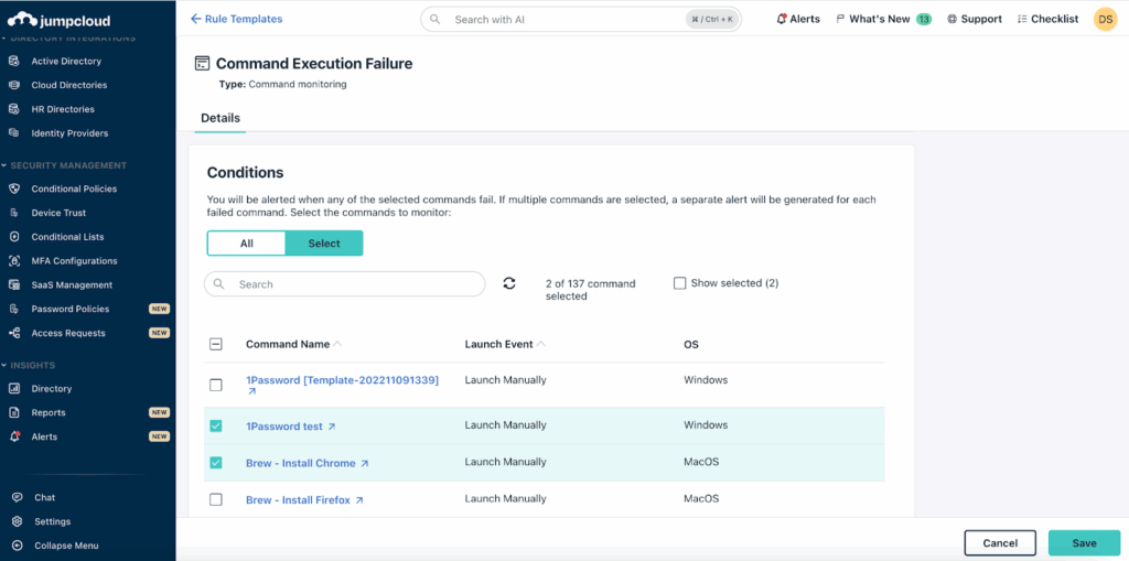 Using custom scripts in JumpCloud alerts involves two main steps. First, you create the command. Next, you set up the alert rule. Let’s walk through each step.