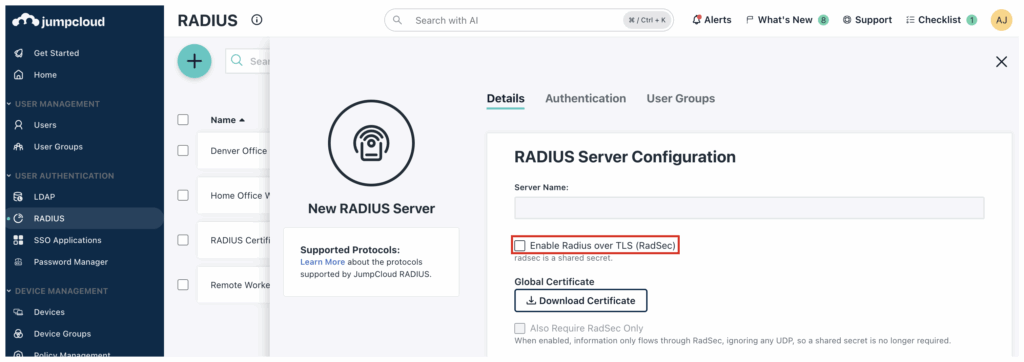 - Trust-Based Authentication: Using digital certificates, RadSec implementation ensures that your network devices are always communicating with a legitimate JumpCloud RADIUS server. This prevents attackers from impersonating a server to steal credentials.