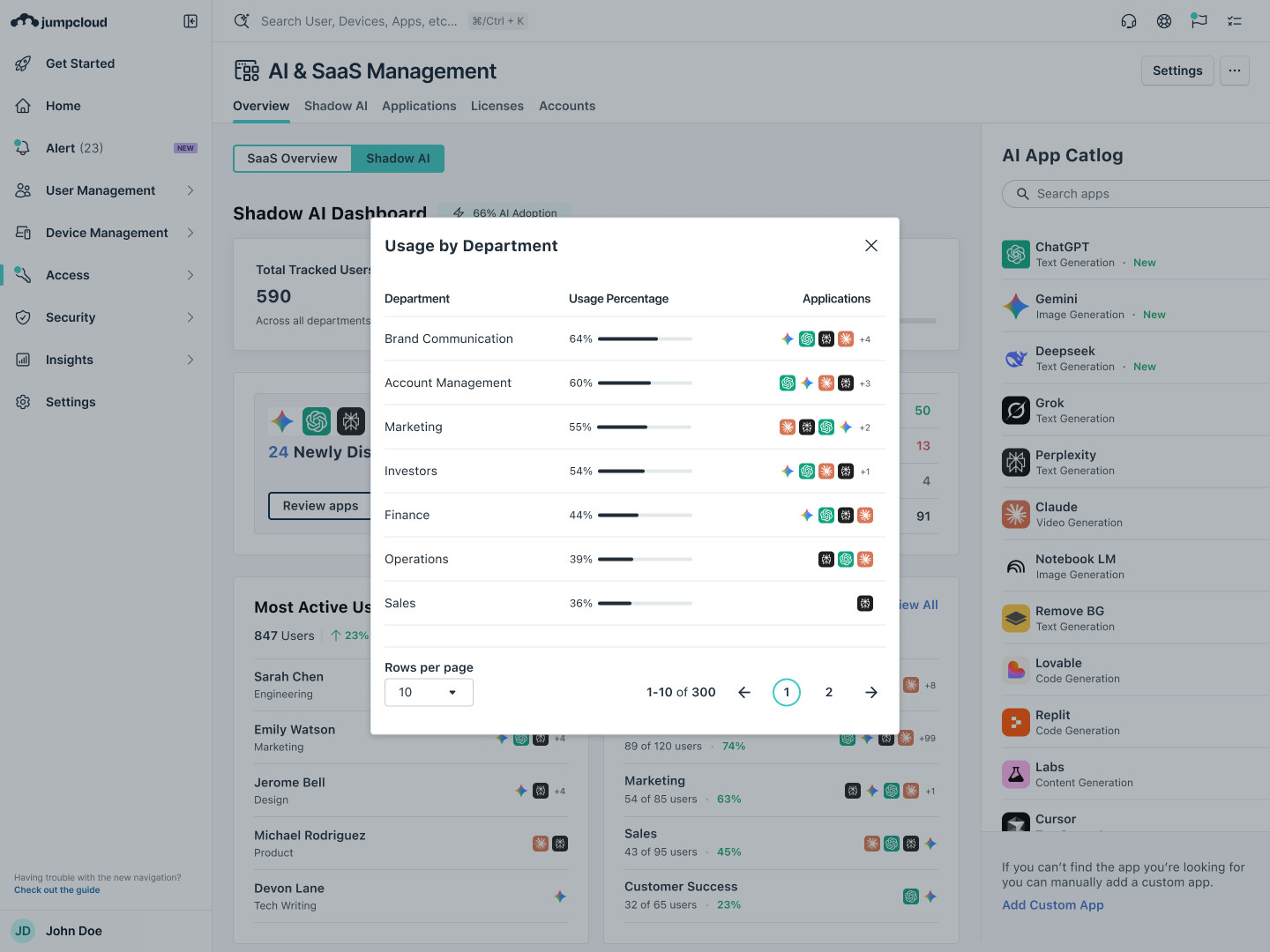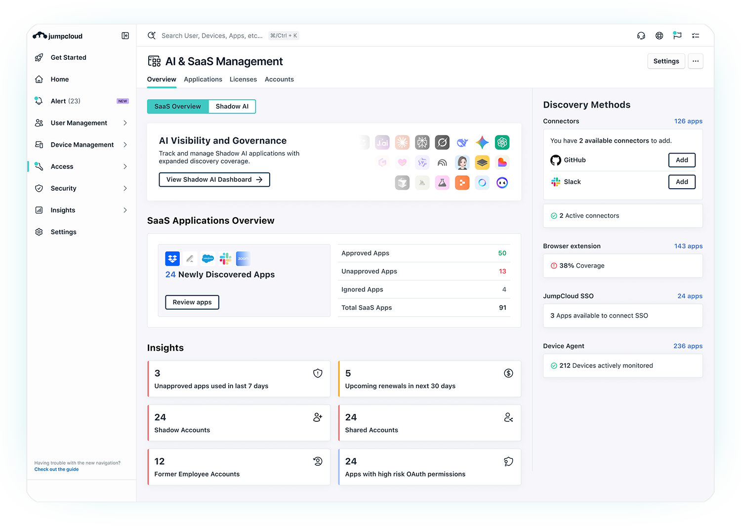 JumpCloud uncovers all AI usage across your organization, enforces access policies, and enables secure innovation and productivity, so you protect what matters, empower what’s next.