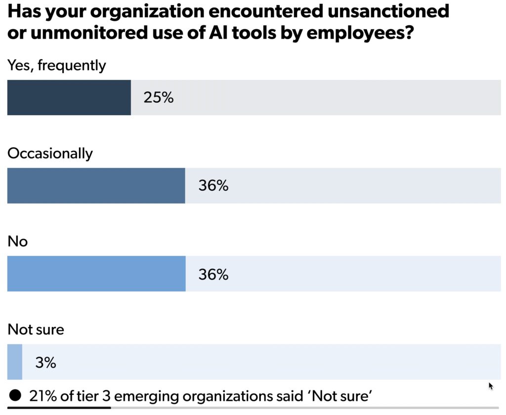 On one side, you have the groundswell of bottoms-up adoption. Our research shows that 61% of organizations report the unsanctioned use of AI tools, a trend often called “shadow AI.” Employees, eager to improve their productivity, are adopting generative AI tools with or without official approval.