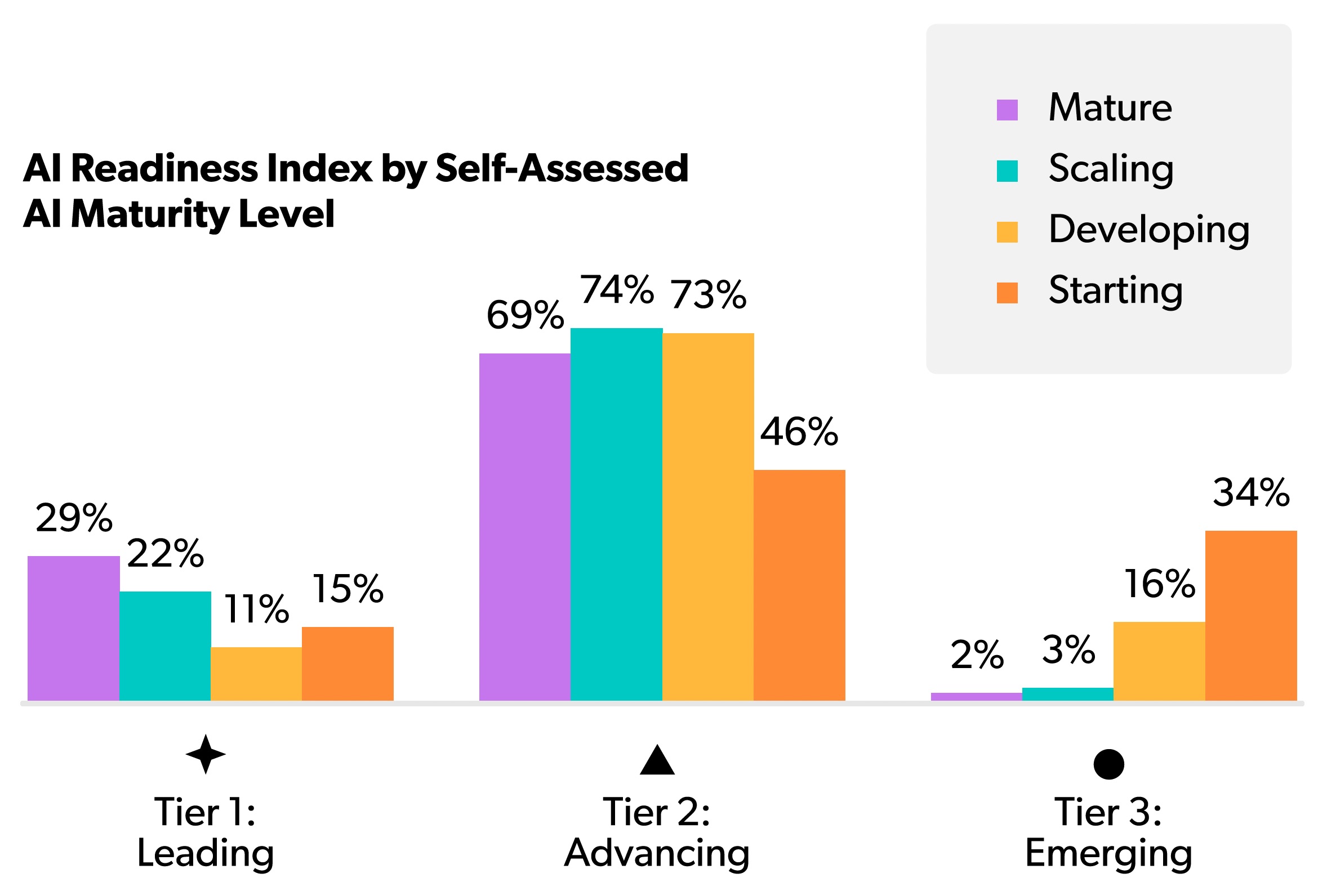 This optimism, however, can mask underlying readiness gaps. The same report highlights this disparity with a striking statistic: 40% of organizations consider themselves “AI Mature,” yet by objective measures, only 22% qualify as “Leading” in their readiness.