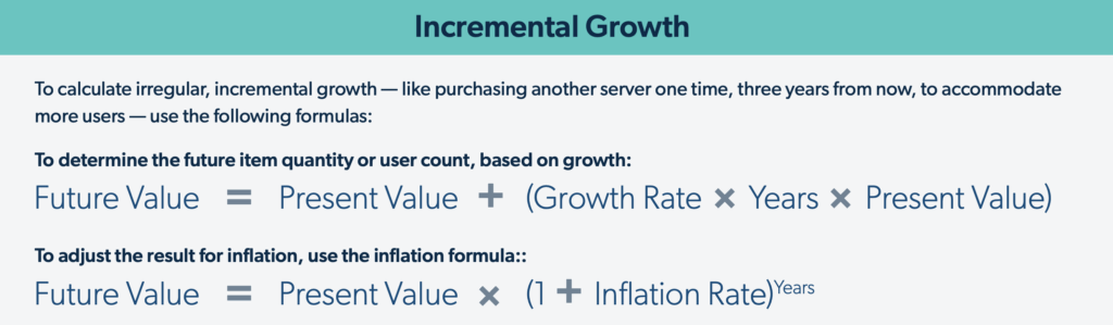 - For Software (S) and Data Center/Hosting (H) costs, find their rate (often monthly) and convert it to your time unit (we recommend years). Account for growth, inflation, and your future time period using the formulas on pages 7 and 8.