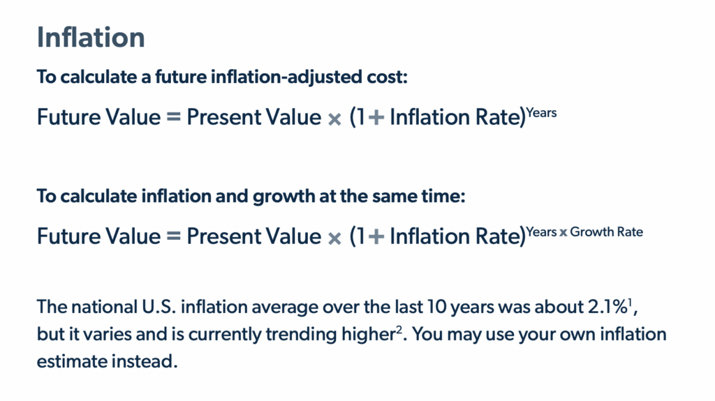 While inflation can seem insignificant or too hard to predict, it makes a notable impact on total cost over time (especially for long time periods). Further, making an informed inflation estimate (like using a historic average) usually yields more realistic projections than ignoring inflation entirely. For example, in most cases, it would be less realistic to imagine that no employee’s salary will go up in the next five years than to estimate that they may rise at the rate of average U.S. inflation.