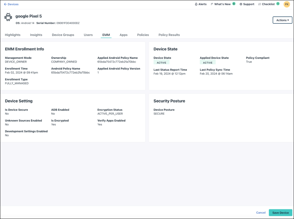 You can view details about each Android device, and view which device groups, users, apps, and policies are applied to the device.