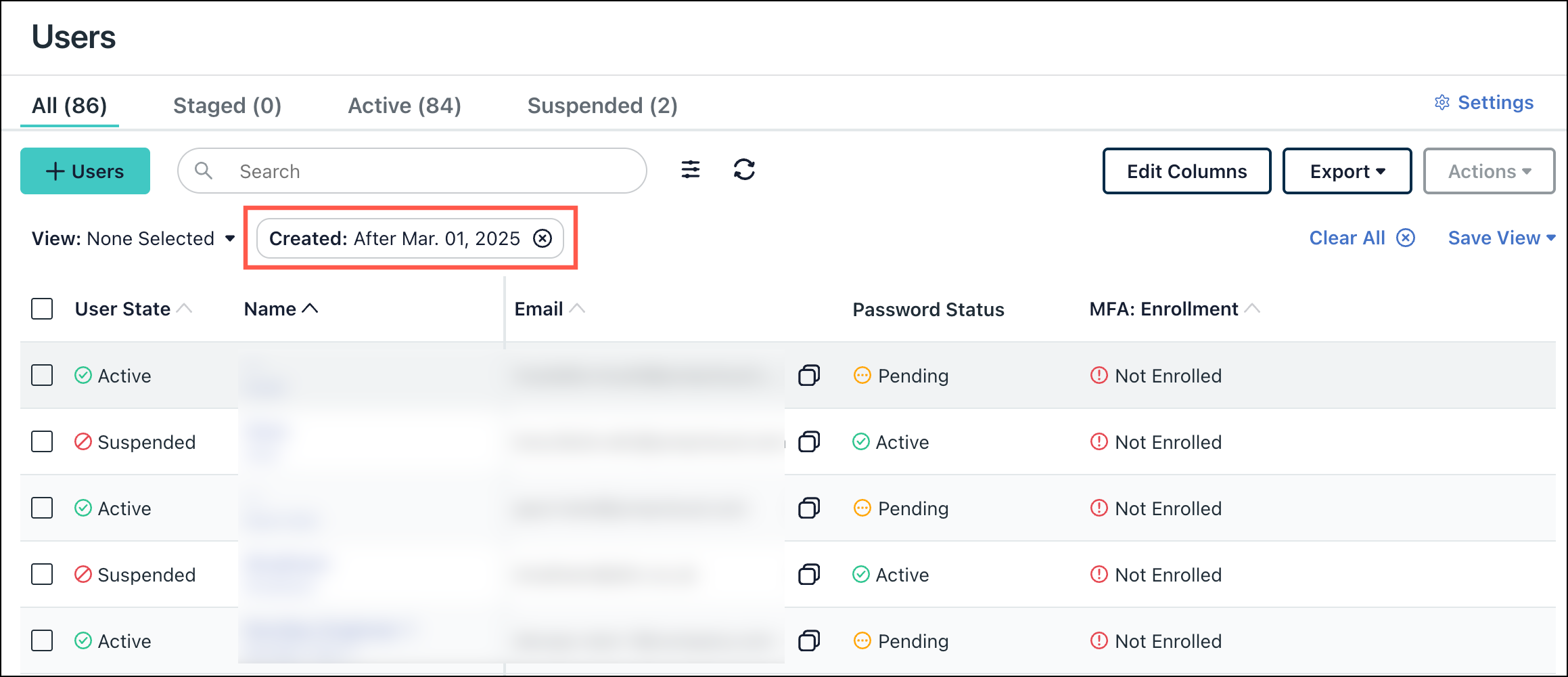 - From the JumpCloud Admin Portal, go to User Management > Users and choose any combination of columns and filters.