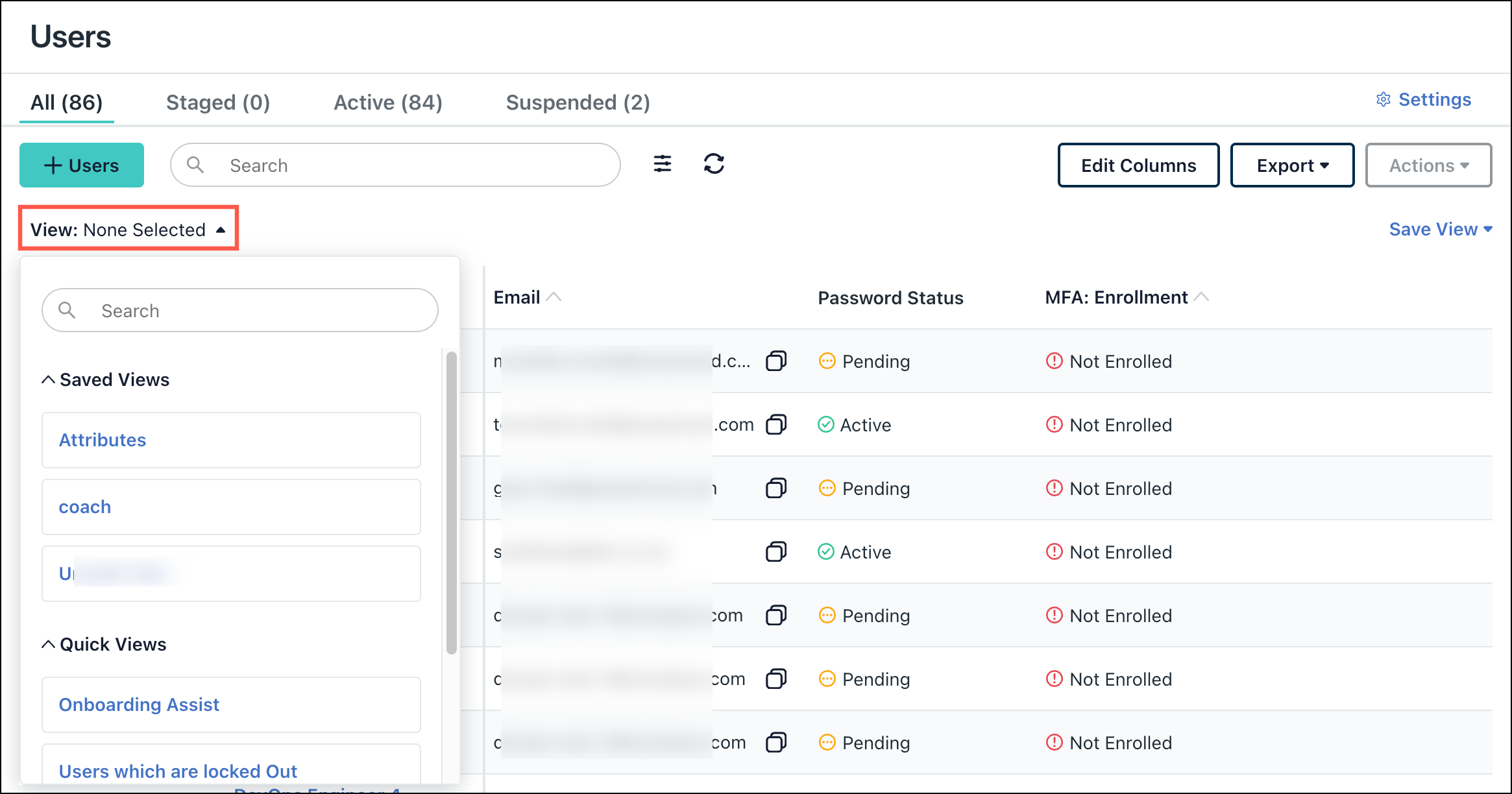 - To change your view, select the View dropdown. Saved views, both private and public, will be displayed along with JumpCloud-created Quick Views.