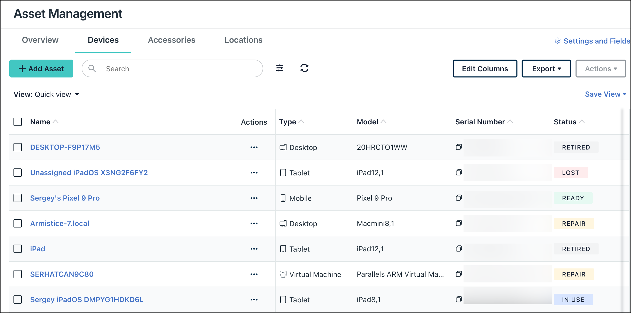 Use fields to label, organize, and track specific information about your assets, like status, service tags, and service dates. You can modify the defaults or create custom fields. Fields are organized by asset class: Global, Devices, Accessories, and Locations.
