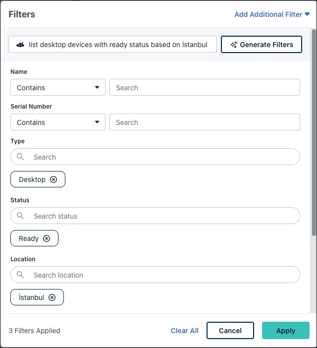 - AI-Powered Filtering: In the top search bar, describe your filter using natural language (for example "desktop devices with ready status in istanbul") then click Generate Filters. The widget automatically applies the relevant filters.
