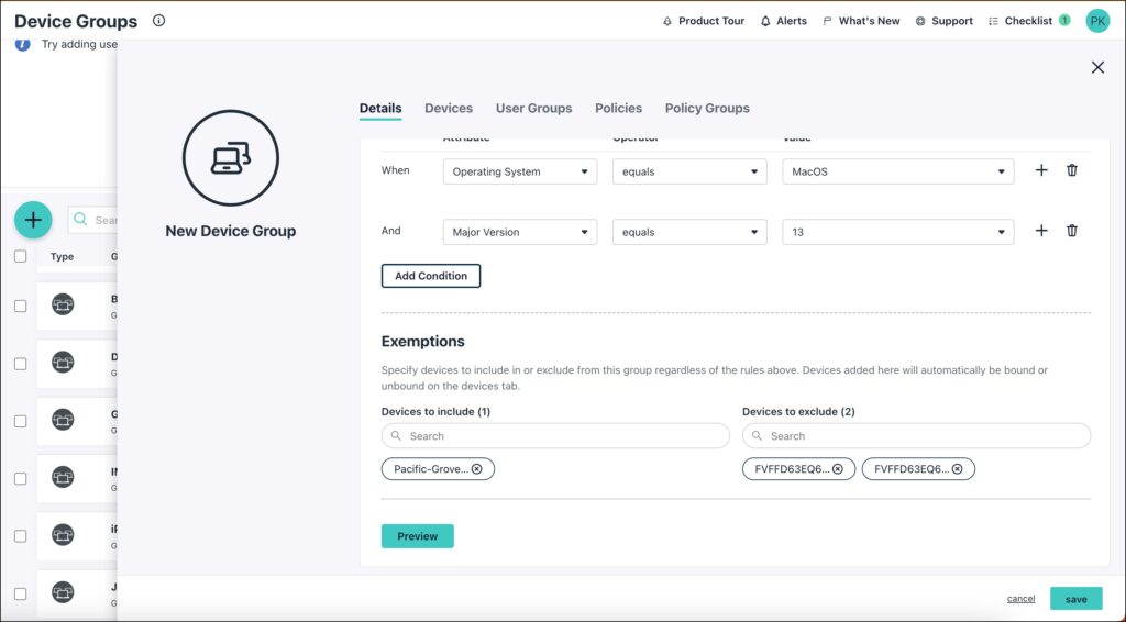 - Exemptions configured to include a device in or exclude a device from a device group are NOT reflected in the Preview Group Membership modal.