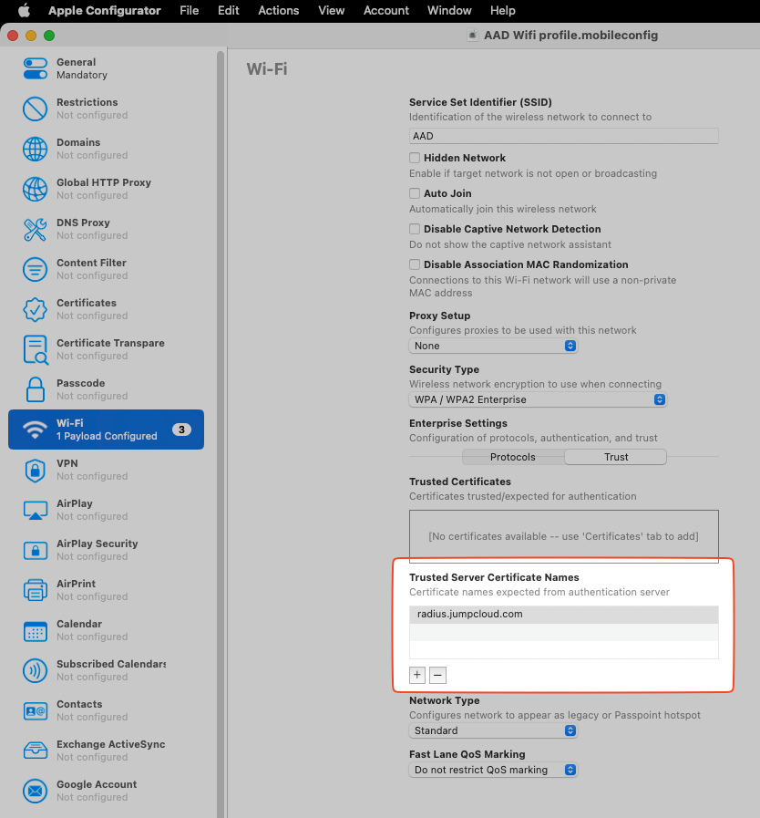 - Under Trusted Server Certificate Names, click + to add and then enter radius.jumpcloud.com