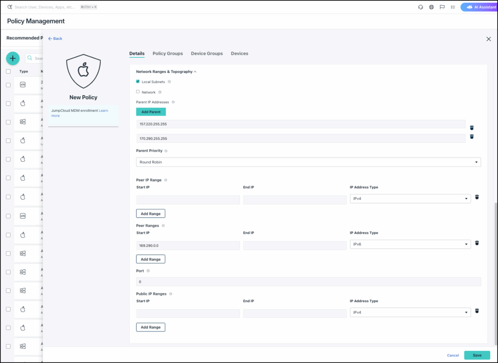 - If you selected Network in Step 9b, under Network IP Range enter the starting and ending IP addresses of user devices to use to share content. For example, 169.254.0.0 - 169.254.255.255. Select IP Address Type and choose IPv4 or IPv6. To add another Peer IP Range, click Add Range.