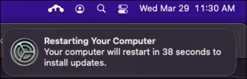 5. Do not close countdown notification on the top right hand corner: An "Update requested" notification will appear, followed by a "Restarting Your Computer" notification on a 60-second countdown. If at any point the user closes these notifications, the upgrade will be postponed until the device checks in again for available updates (this happens once every 24 hours).