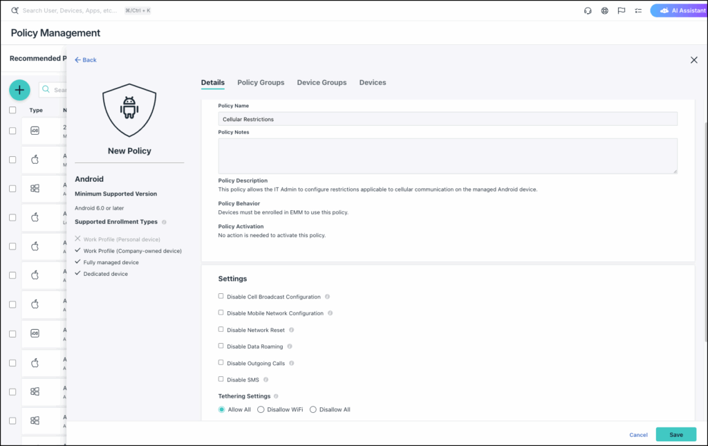 The Android Cellular Restrictions Policy lets you configure restrictions for cellular network communication on managed Android devices. Restricting these types of communication can keep users on the devices focused on executing specific tasks. This policy works for devices running Android 7.0 and later.