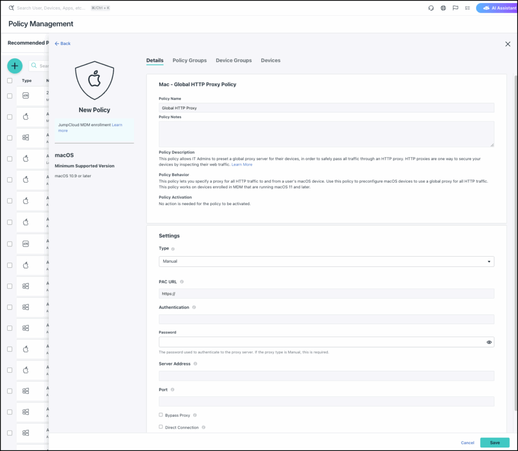 This policy lets IT Admins preconfigure a global proxy server for macOS and iOS devices, in order to safely pass all traffic through an HTTP proxy set by this policy. HTTP proxies are used to secure users’ devices by inspecting their web traffic.