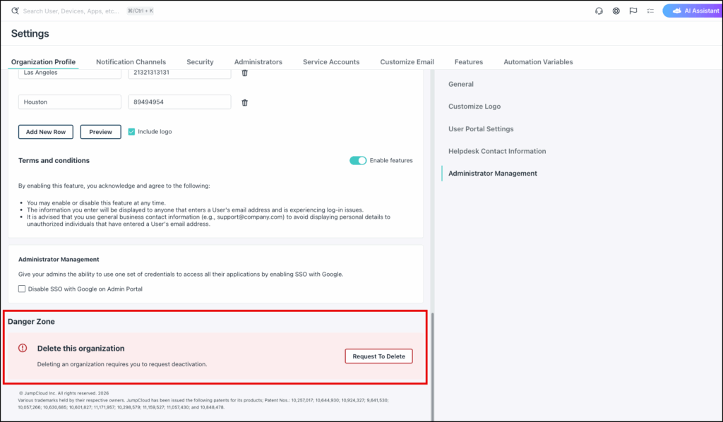 - A JumpCloud Admin with Billing (Super Admin) associated with the org has to send in the request for deletion. JumpCloud might ask for additional information to confirm the identity of the person requesting the deletion.