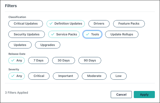 The search feature supports KB titles and CVE numbers. To ensure you are viewing the most current information, use the Manual Refresh icon to update the list.