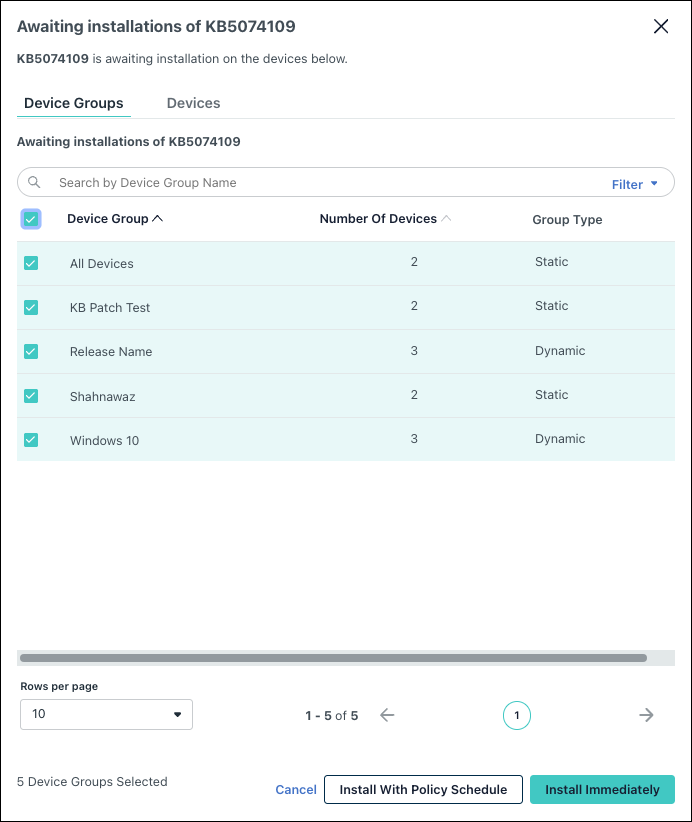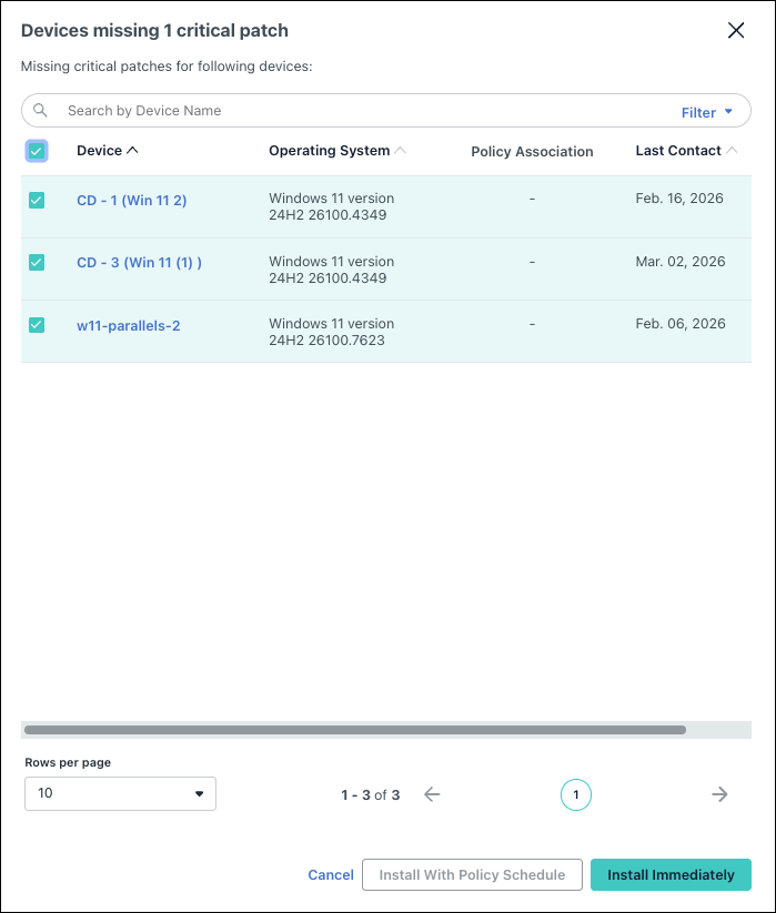 - Select one or more devices and click Install Immediately. This displays the Install Immediately modal window.