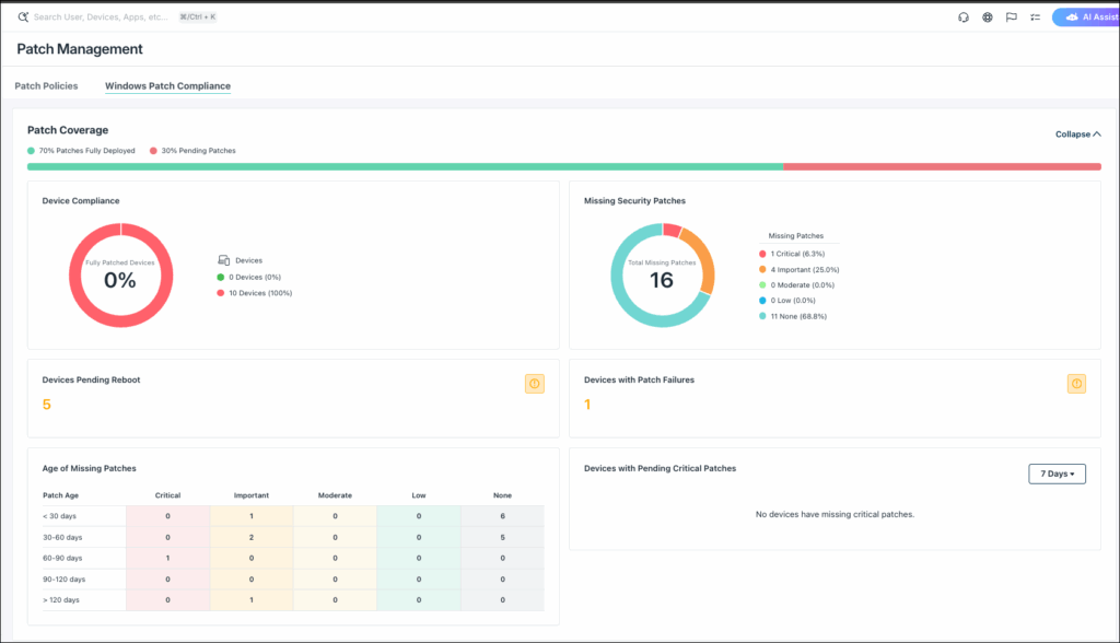 - Initial Data Sync - Once a Windows device is successfully enrolled, patch data collection begins automatically as part of the initial backend processing. There may be a short synchronization window before specific KB details are populated and visible within the dashboard. During this period, the dashboard may temporarily show no patch records or indicate that no KB data is available, this is an expected behavior and not a system error.