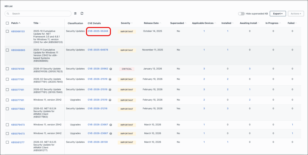 - Severity - Impact of the KB on the device such as Critical, Important, or N/A.