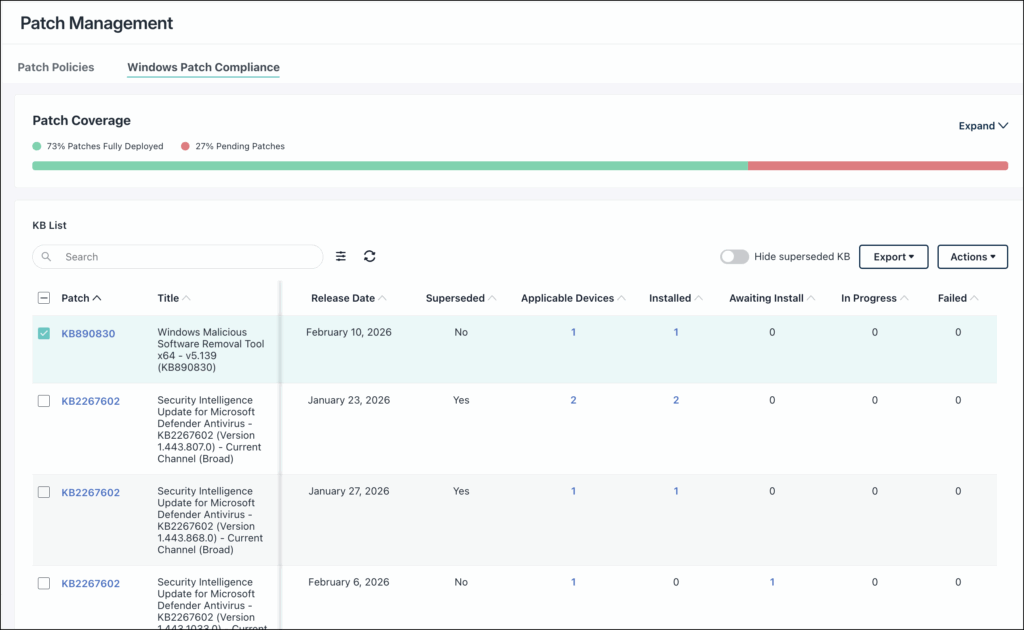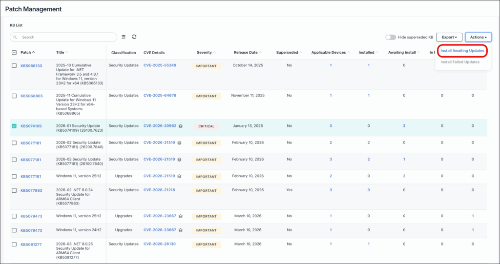 You can select and approve a single or multiple KBs for installation on a single or multiple devices. Approval actions are only available for devices where the KB status is Awaiting Install.