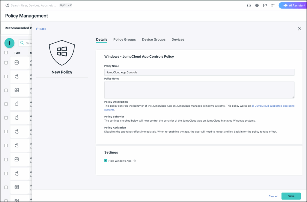 To create a JumpCloud App Controls policy: