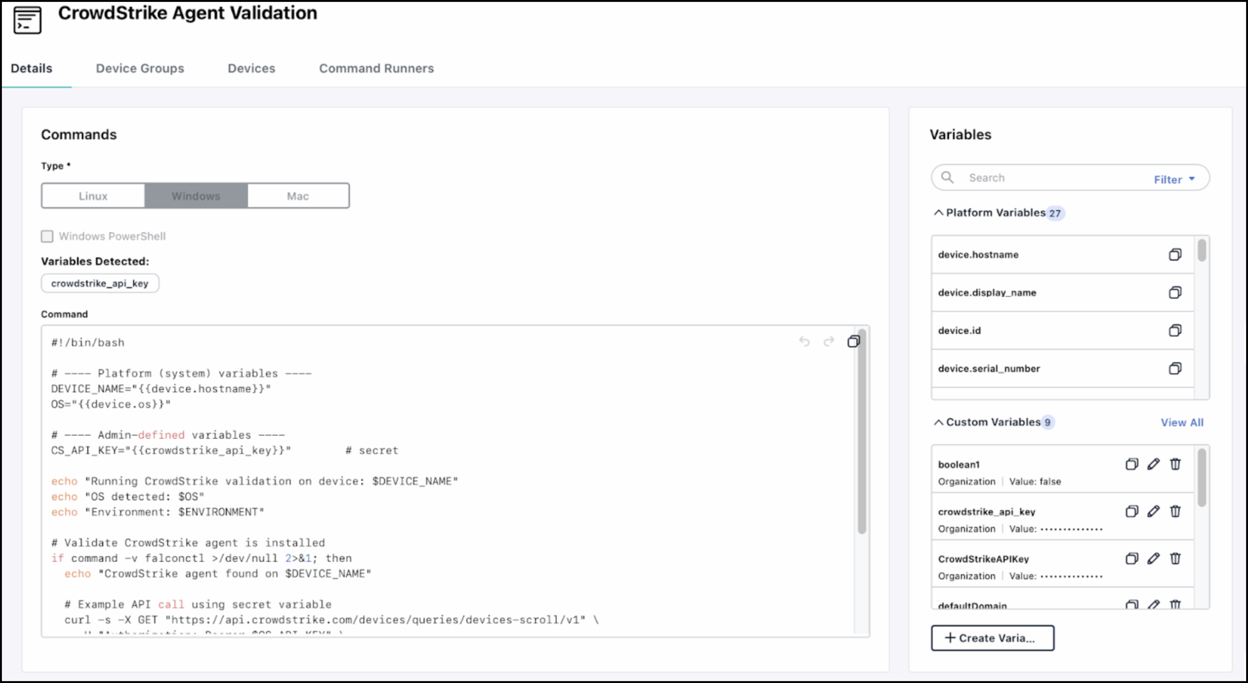Once you’ve created a variable, you can use that variable in a command script without hard-coding the value in the Command Details section.