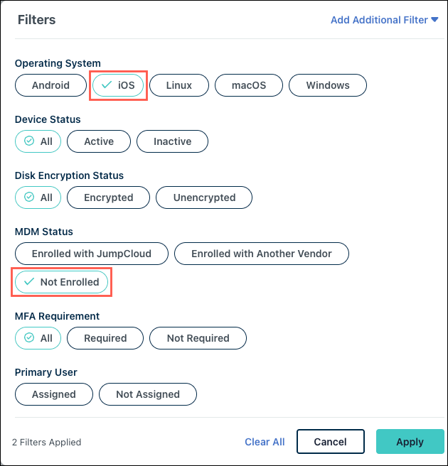 - To identify iOS / iPadOS devices that are not enrolled in JumpCloud MDM, click Filters and select the following: