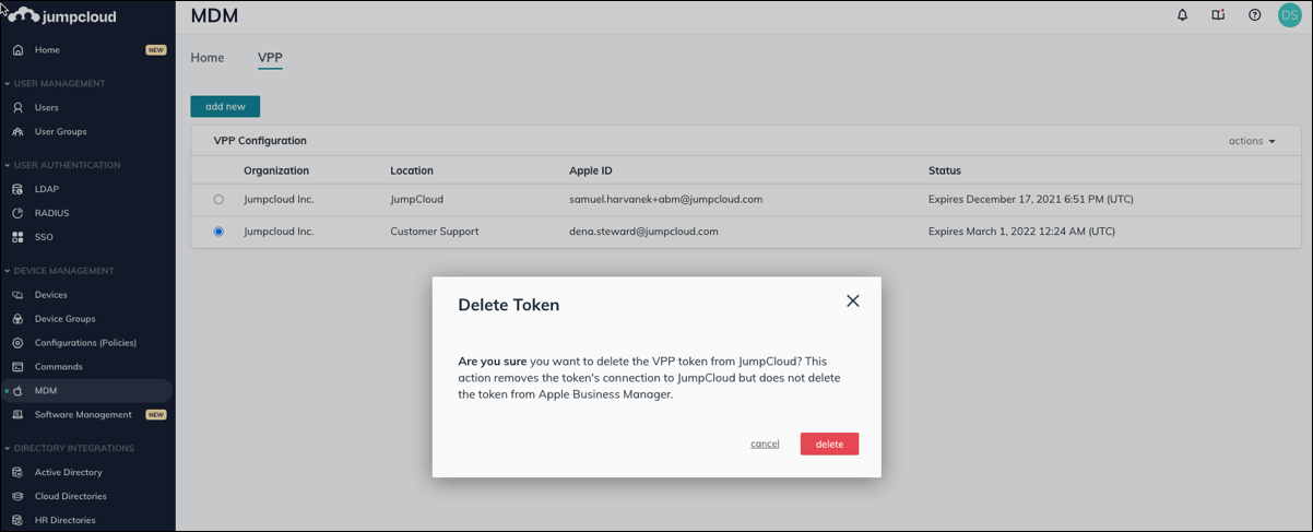- Deleting a location’s token removes all the location’s apps from JumpCloud and will no longer be managed by JumpCloud. Deleting the token removes the token in JumpCloud, but does not remove the token in ABM or ASM.