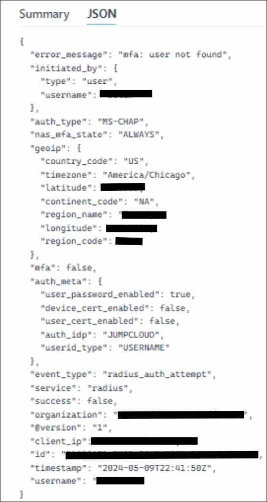 For example, the screenshot below is a JSON from the RADIUS failed event which contains information such as Username, Error Message, Country Code, Region Code, and Timezone. It is also observed that an "User not found" error message is displayed as no such user exits in the organization.