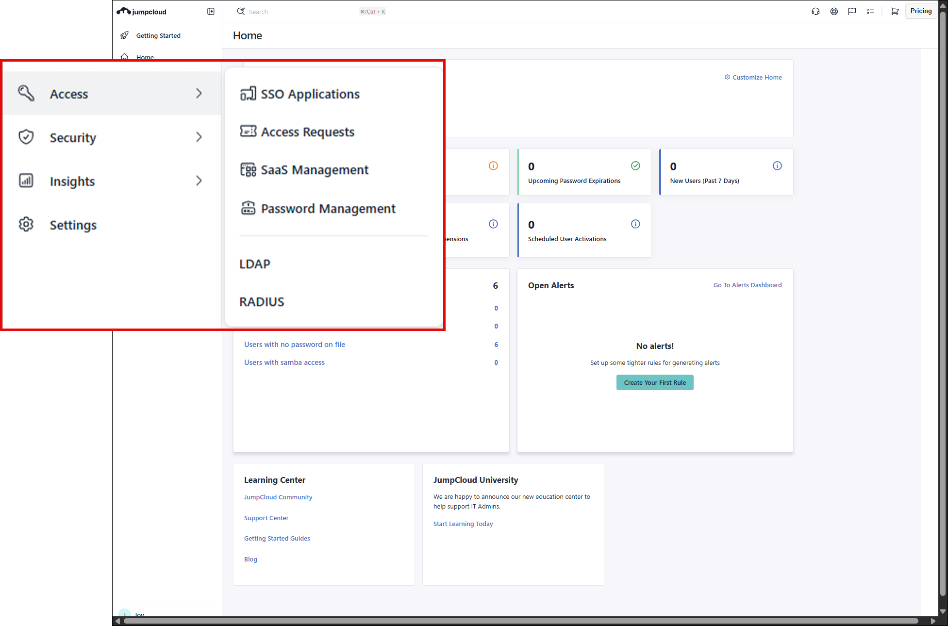 Renamed to Access and reorganized the list. Added Access Requests and SaaS Management and renamed Password Manager to Password Management.