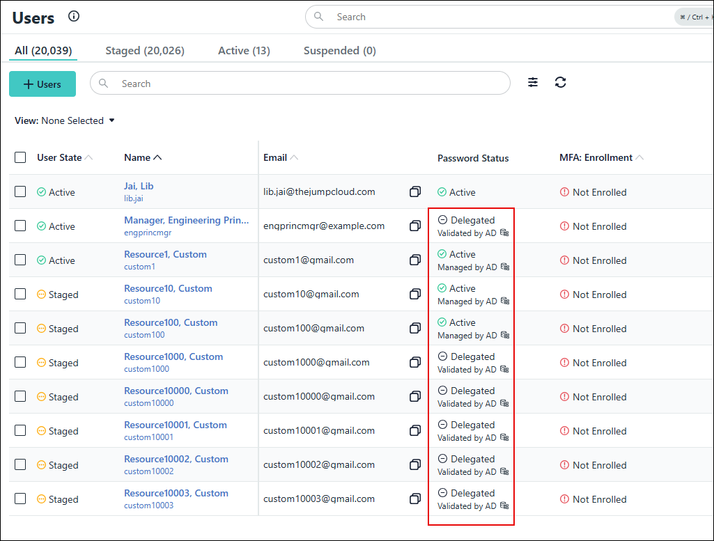 The user is created with a Password Status of Password Pending and will have an AD Integration badge below their email address. The user state is controlled by setting for Users>Settings>Default User State for User Creation> Manual/Single User API. See Manage User States for more information about this setting.