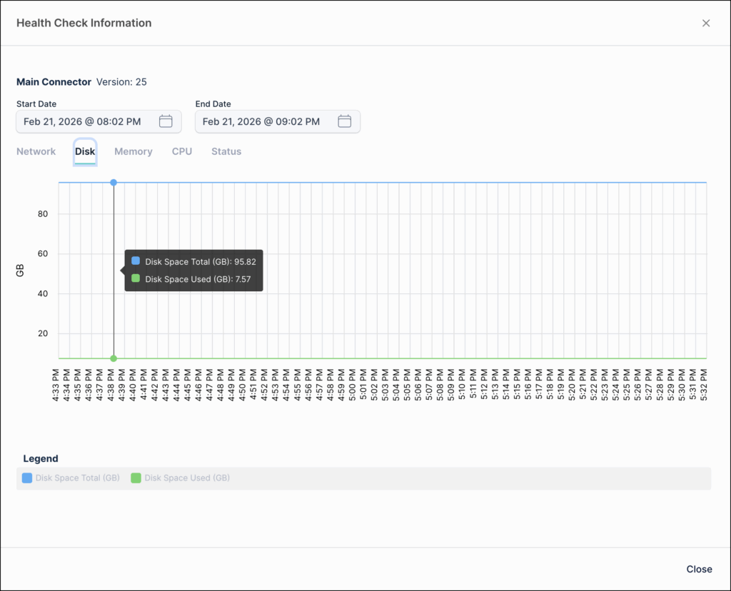 - On the Health Check Information page, select the Status tab to view the connector's operational status. A status value of 1 indicates the connector is working as expected, while 0 indicates it is down.