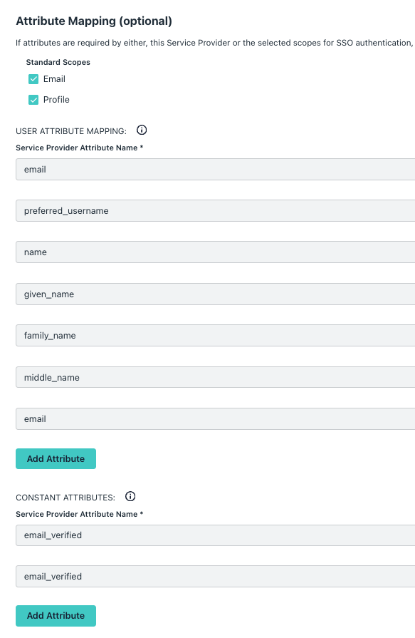 - Under USER ATTRIBUTE MAPPINGS, click Add Attribute to add the attributes shown in the image below