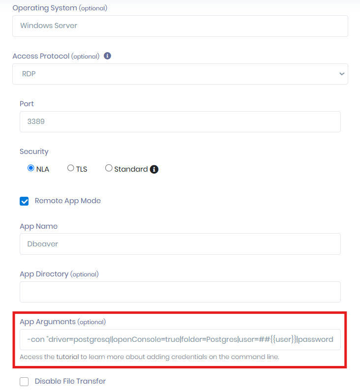 Note: Not all parameters shown in the example are mandatory for using RemoteApp. Some parameters are specific to certain scenarios and applications.