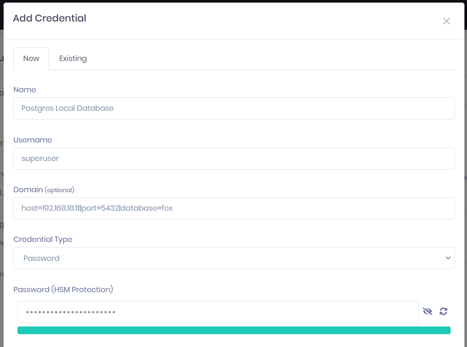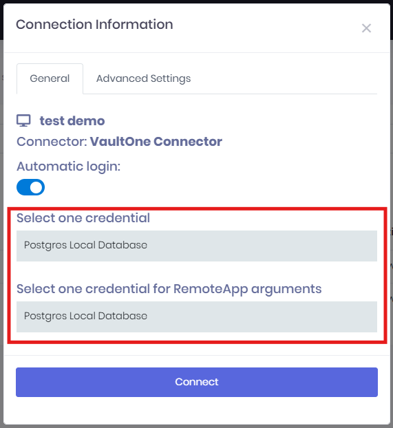 - If the arguments include keys such as user={{user}}|password={{password}}, two fields will appear during the connection process: