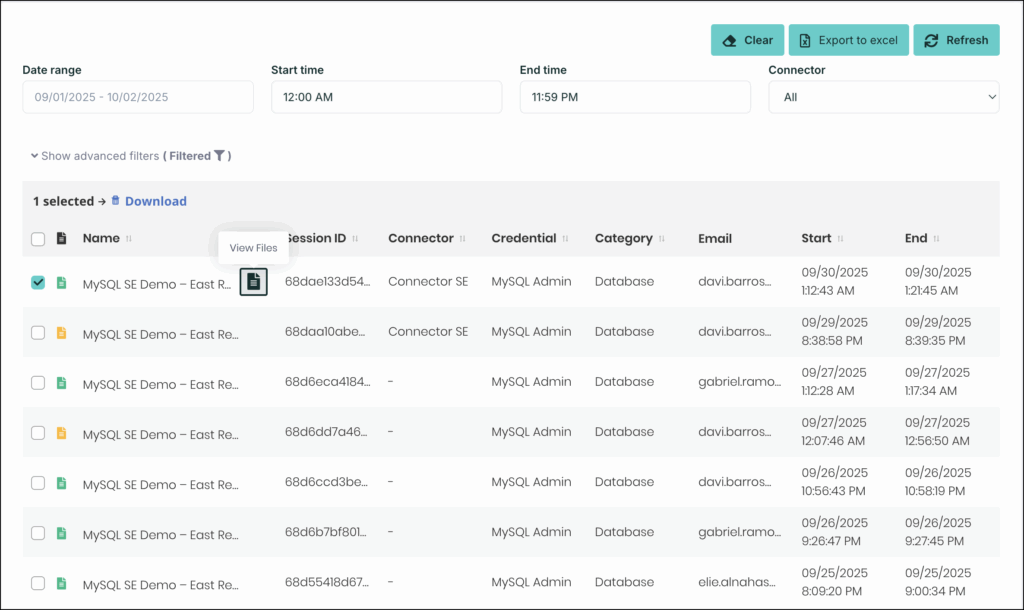 1. On the Session Files window, the complete history of accessed files and activities is displayed.