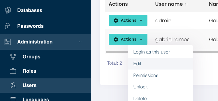 - Locate the user whose username you want to change and click on the Actions > Edit.