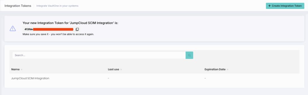 Copy the token that is displayed and store it securely. This token will authenticate JumpCloud to VaultOne’s SCIM API.