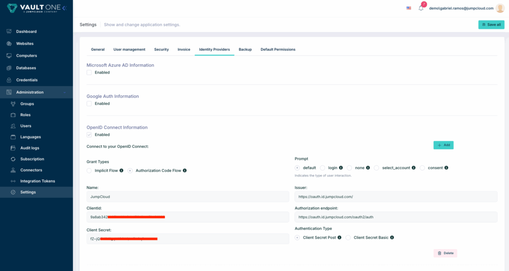 Configure JumpCloud as your OpenID Connect (OIDC) Identity Provider to enable seamless and secure authentication for VaultOne users.