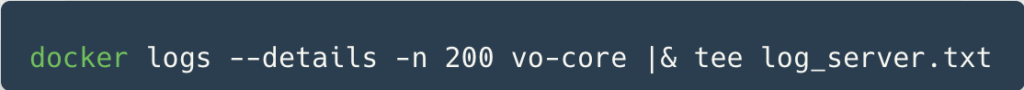 docker logs --details -n 200 vo-core |& tee <file_name>.txt